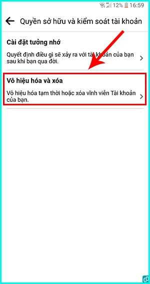 Bước 5: Trên giao diện Quyền sở hữu và kiểm soát tài khoản, bạn hãy nhấn chọn vào mục Vô hiệu hóa và xóa.